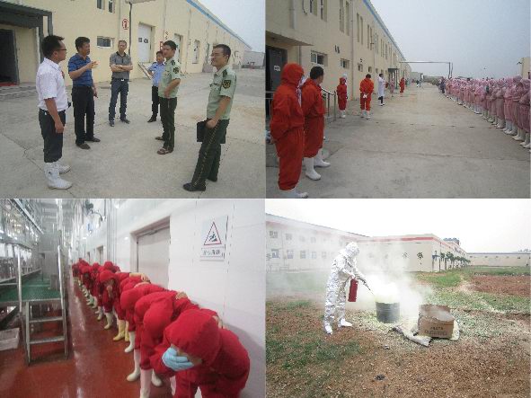 吉林德惠寶源豐禽業(yè)發(fā)生特大事故,造成120人遇難,在全國安全月伊始之時發(fā)生如此重大事故,教訓慘痛。為吸取這一慘痛的經驗教訓,落實于董事長關于安全整頓的要求,進一步增強員工安全意識和自我救助能力,公司于2013年6月7日在各分廠車間、制冷機房和廠區(qū)空地三處演習地點舉行了緊急疏散、液氨泄漏緊急處置和消防滅火的實戰(zhàn)演練。