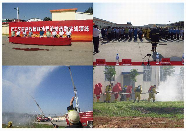 洛陽市安監(jiān)局領(lǐng)導(dǎo)、洛陽市消防支隊(duì)領(lǐng)導(dǎo)、區(qū)領(lǐng)導(dǎo)迅速趕赴現(xiàn)場(chǎng)指揮救援,8臺(tái)消防車、2臺(tái)救護(hù)車在公安交警車開道下呼嘯而至,120名消氣防戰(zhàn)斗員訓(xùn)練有素展開救援,生產(chǎn)調(diào)整組、安全環(huán)保組、警戒保衛(wèi)組、設(shè)備搶修組、信息管理組共50人分別按預(yù)案井然有序開展現(xiàn)場(chǎng)工作。由于反應(yīng)迅速,處置得當(dāng),沒有造成周圍水體、空氣環(huán)境污染,沒有發(fā)生其他次生事故,1名中毒的現(xiàn)場(chǎng)操作人員得到及時(shí)救治。本次演練為力求貼近實(shí)戰(zhàn),對(duì)突發(fā)事故應(yīng)急處理真正起到指導(dǎo)和演練作用,改變以往演練模式,應(yīng)急指揮部演練中還臨時(shí)增設(shè)了演練科目。